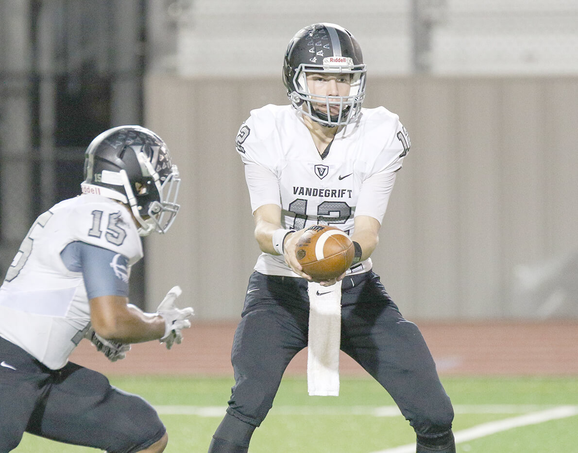 Vandegrift Vipers senior quarterback Justin Moore (12) hands the ball off to junior running back Isaiah Smallwood (15) during a high school football game between the Leander Lions and the Vandegrift Vipers at Bible Stadium in Leander, Texas, on October 13, 2017.