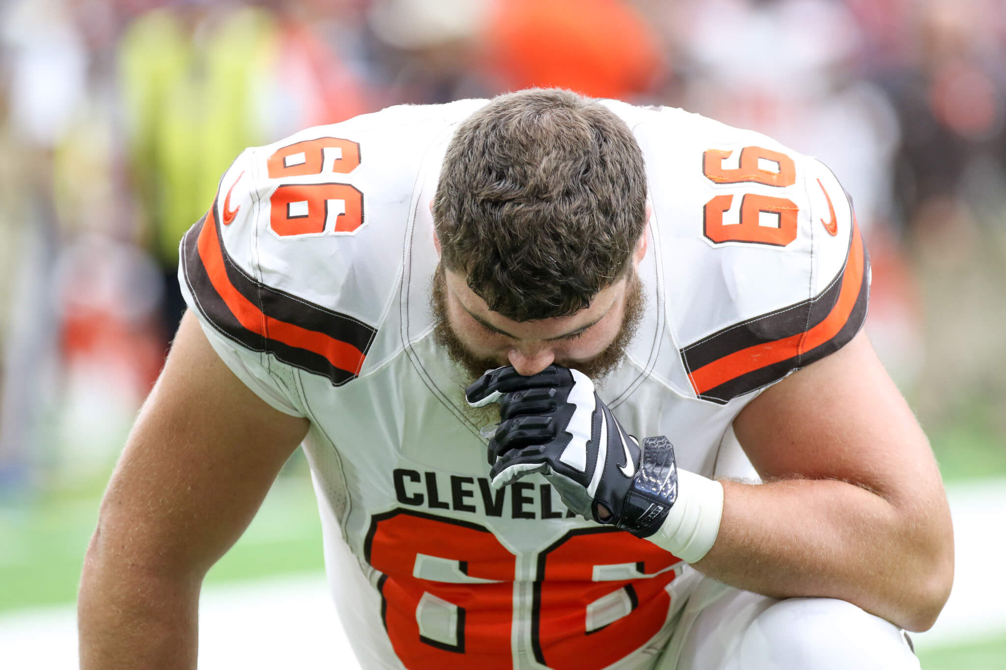Cleveland Browns offensive guard Spencer Drango (66) takes a moment on the field before the start of an NFL game between the Houston Texans and the Cleveland Browns at NRG Stadium in Houston, Texas.