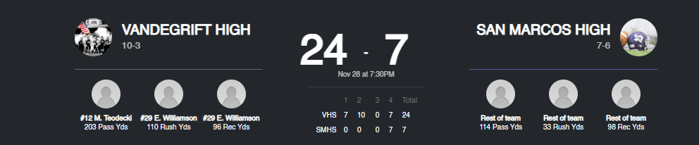 “We are preparing for this game like we prepare for every game every week,” shared Drew Sanders, VHS head football coach. “We have a winning routine of prep that we’ve used successfully for years, and we will focus on that. We are excited to be playing December football once again against a really good Dripping Springs team.”