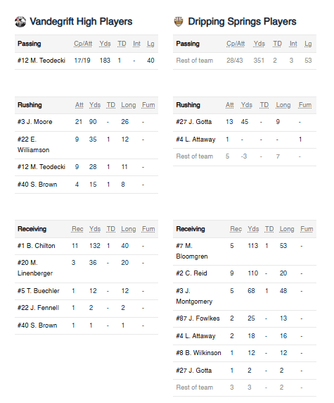 Vandegrift beats Dripping Springs 27-20, moves on in the state playoffs Vandegrift 12-2 wins its rematch with Dripping Springs 12-2 on December 6 at the Alamodome.