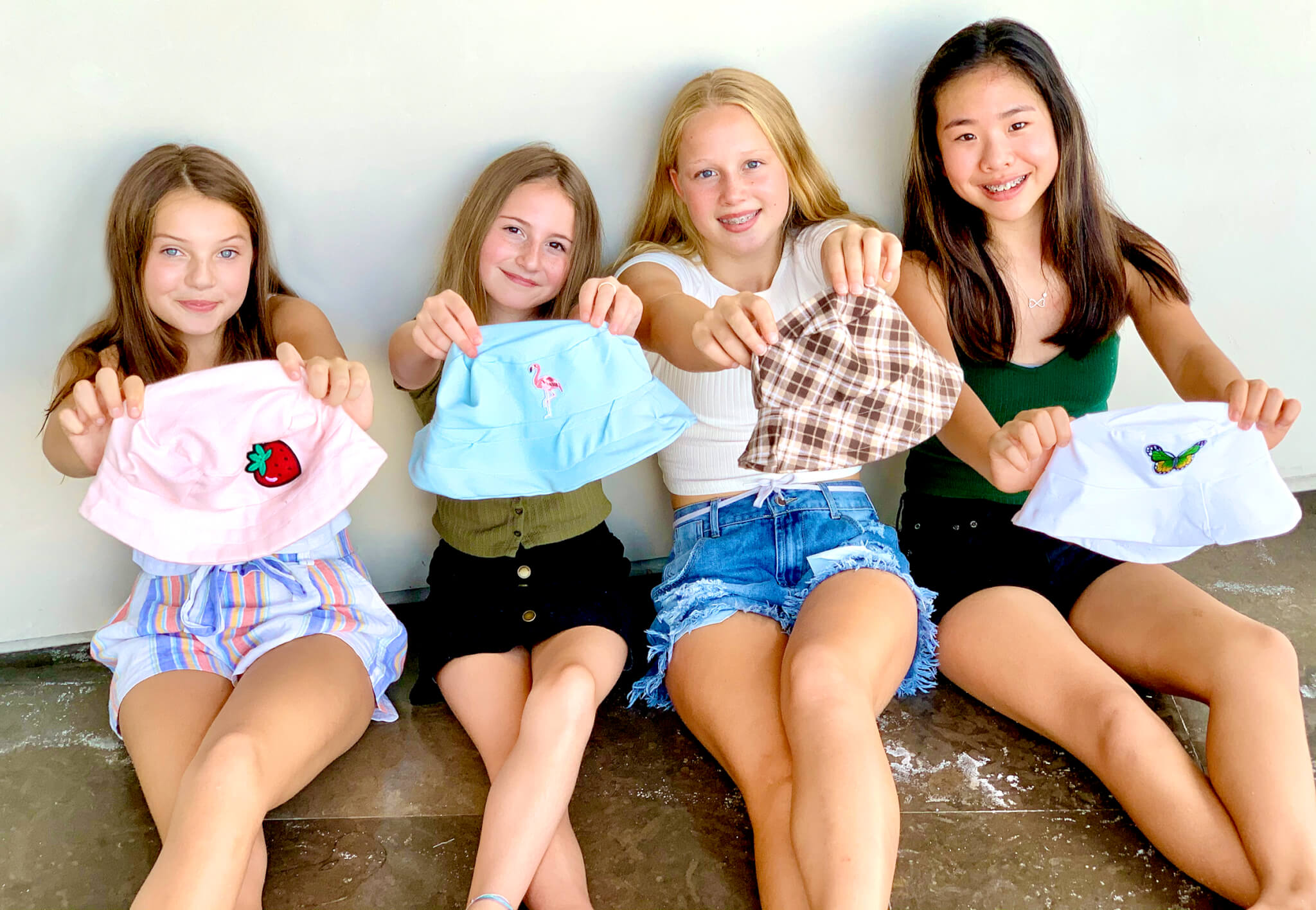 (L-R) Pauline Pons, Emily Holick, Kaia Haley and Amy Pan show off different designs of Honey Blossom Bucket Hats — the creation of Haley during the COVID-19 pandemic.