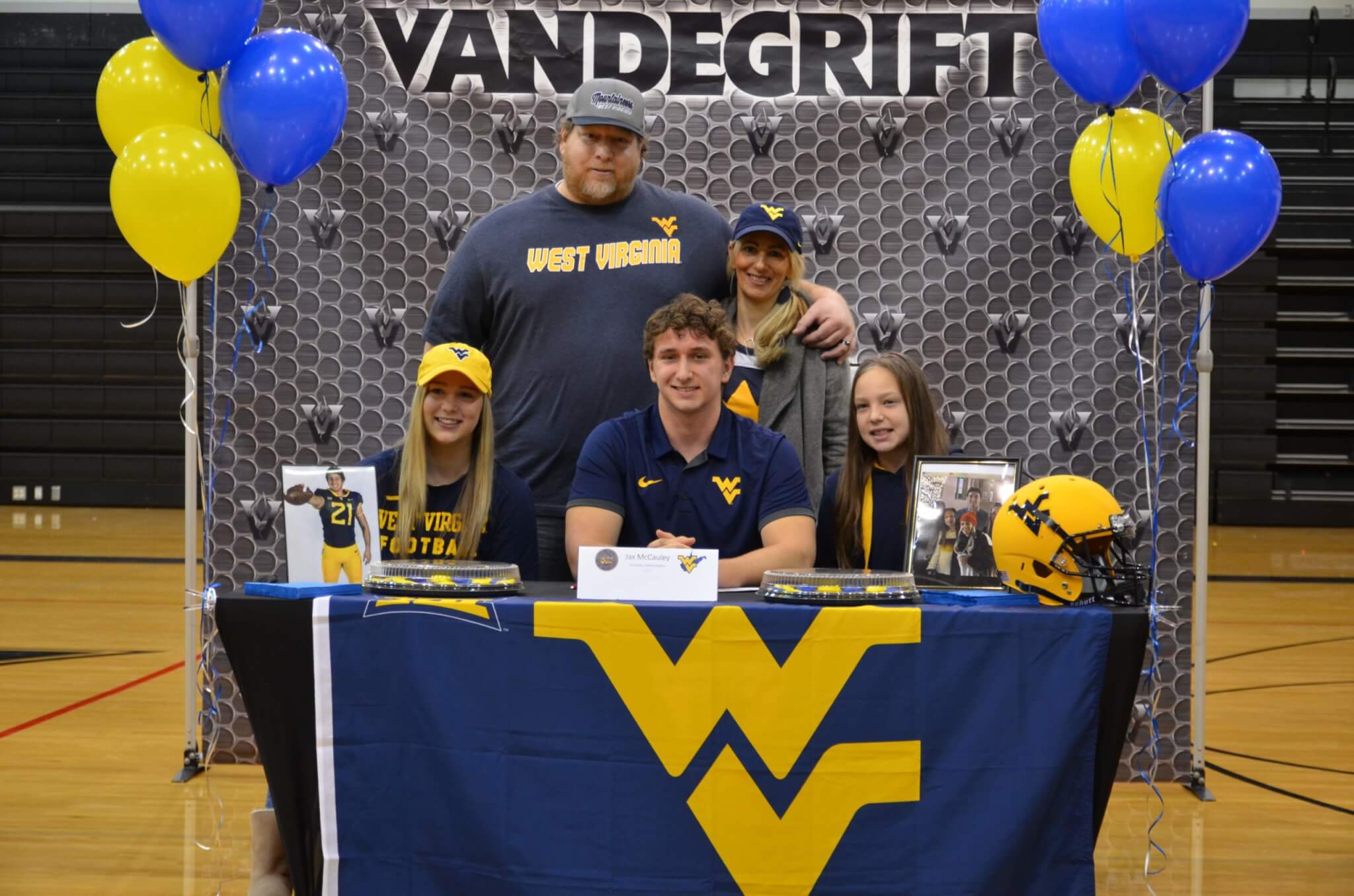 Jax McCauley signs a letter of intent to play football at West Virginia University in Morgantown on Feb. 5, 2020.