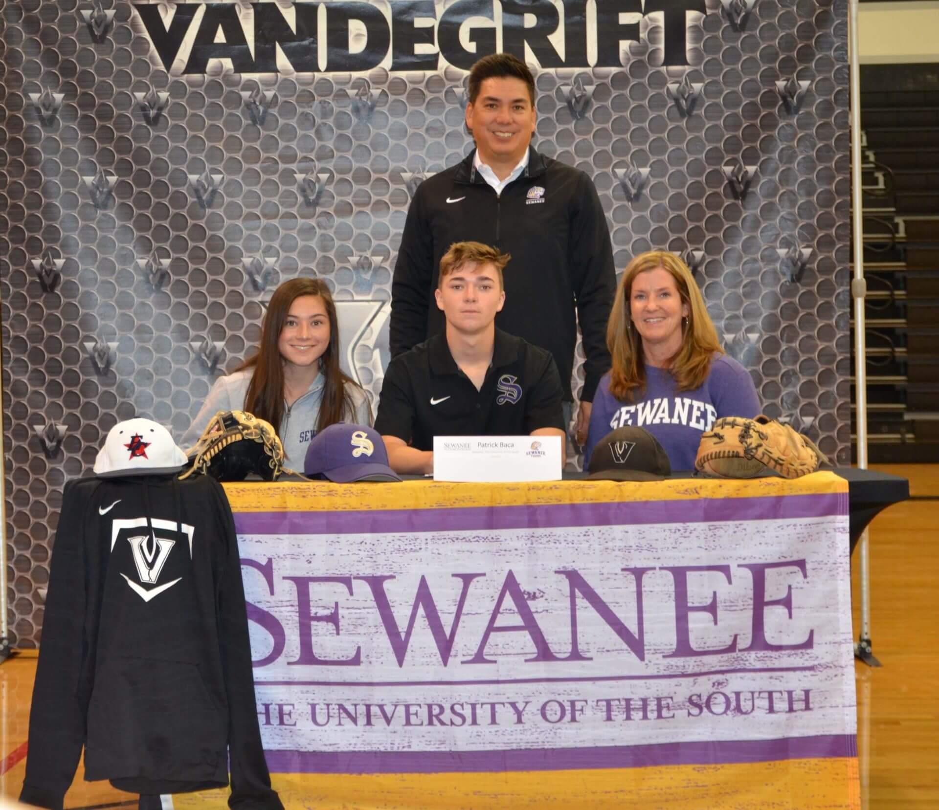 Patrick Baca signs a letter of intent to play baseball at the University of the South at Sewanee, Tenn. on Feb. 5, 2020.