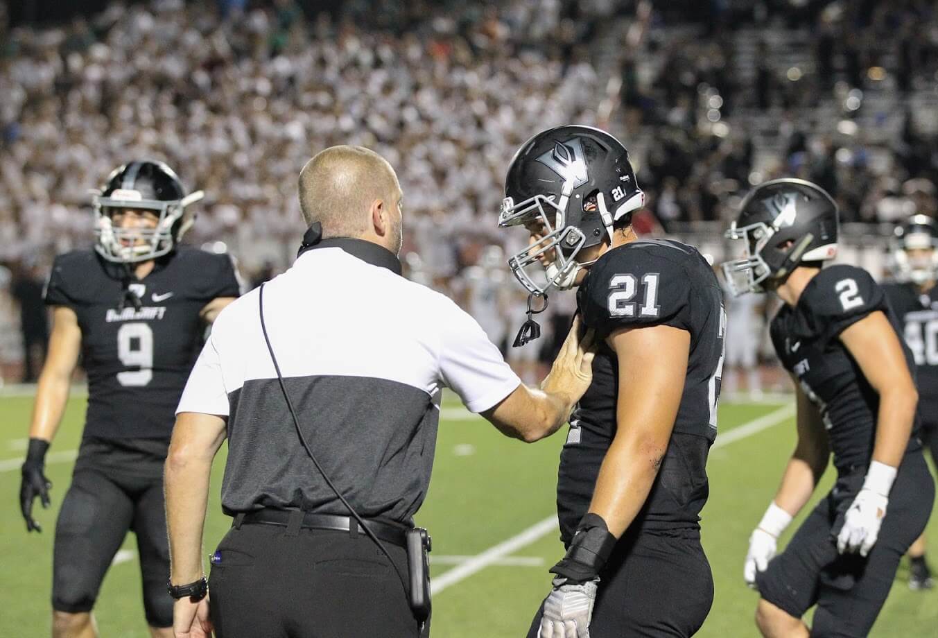 Vandegrift Vipers head coach Drew Sanders talks with linebacker Jax McCauley during a high school football game between Vandegrift and Cedar Park at Monroe Stadium in Austin, Texas on August 30, 2019.