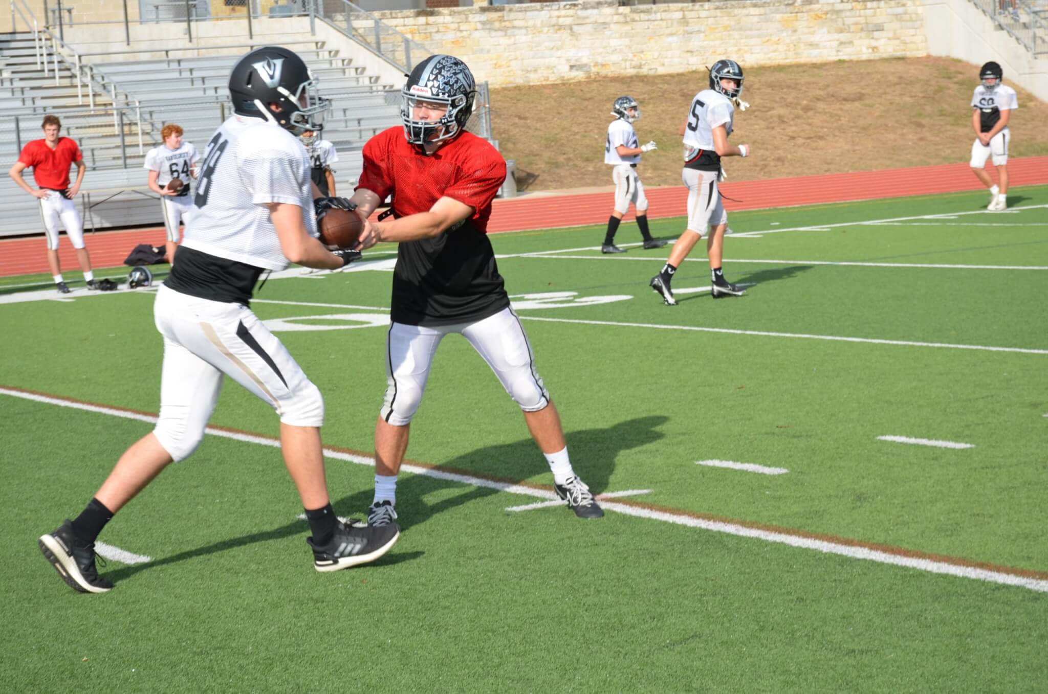 Tommy1 ← Previous Next → Vandegrift quarterback Ryan Back hands off the football to Tommy Hartman in practice.