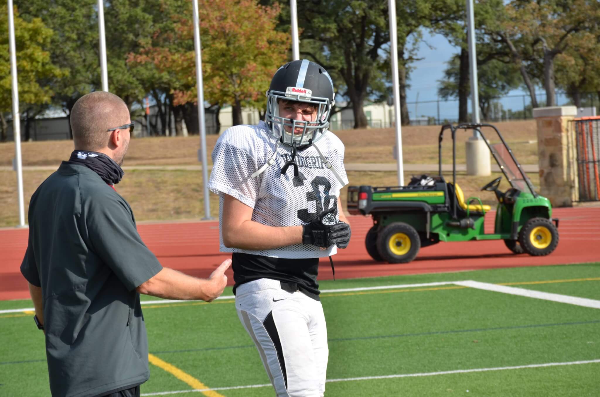 Drew Sanders, VHS head coach, encourages Tommy Hartman after practice.